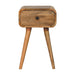 - Featuring a single compact drawer with a subtle knob for discreet storage, it rests on tapered Nordic-style legs that add a touch of retro charm.