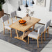 Material | Tabletop:Acacia veneer+MDF; Table frame: Rubber wood; Chair: Rubber wood+foam+linen fabric |
