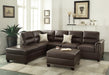 Description :- Functional style is defined with this 3-piece sectional sofa set that includes a large seating space, double tiered pillow cushion back support and arm rest trimmed in nickel finished studs. It also features a reversible chaise and accent cocktail ottoman with matching stud trim. Available in espresso and white bonded leather, and chocolate and sand polyfiber. Product Dimensions :- Reversible Chaise: 34' x 84' x 35'H Sofa: 78' x 34' x 35'H Ottoman: 38' x 26' x 19'H Overall Sectional : 112' x 84' x 35'H Listing Includes :- 3pcs Reversible Sectional Sofa w/ 2 Pillows (Sofa, Reversible Chaise And Storage Ottoman) Only. Assembly : Simple Assembly Required. Features:- •Modern / Contemporary •Espresso Color •Faux Leather •Reversible chaise •Pillows Included