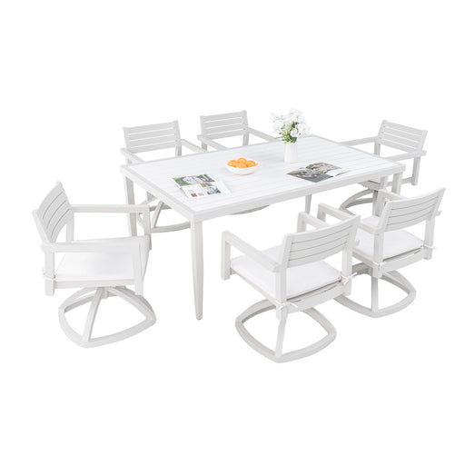 View full detailsModern 7PC Patio Aluminum Furniture Dining Set with Swivel Rockers, Sunbrella Cushions, Two-Tone Table, Matte White+Grayish