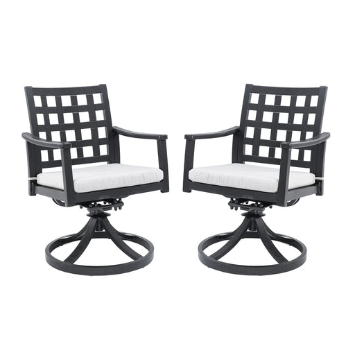 View full detailsModern Classic - 2-Piece Outdoor Dining Swivel Rockers with Sunbrella Cushion, Lattice Design, Ember Black Finish, Weather-Resistant Aluminum Frame
