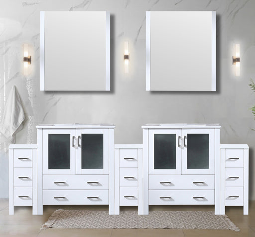 View full detailsWhite Double Bath Vanity 96 in. W x 18.25 in. D, with Side Cabinets, and White Ceramic Top